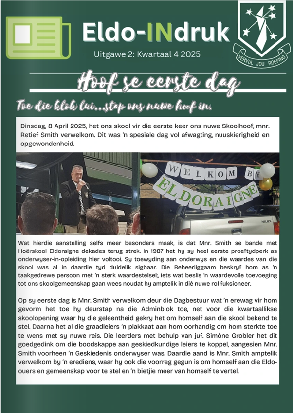 Die Eldo-INdruk is ons skoolkoerant deur die leerders vir die leerders. Dit kom twee maal per jaar uit volgens kwartale 1 en 2 en dan kwartale 3 en 4. Dit is 'n lekker oorsig oor wat alles gebeur het in die skool, baie foto's en eldo gees!